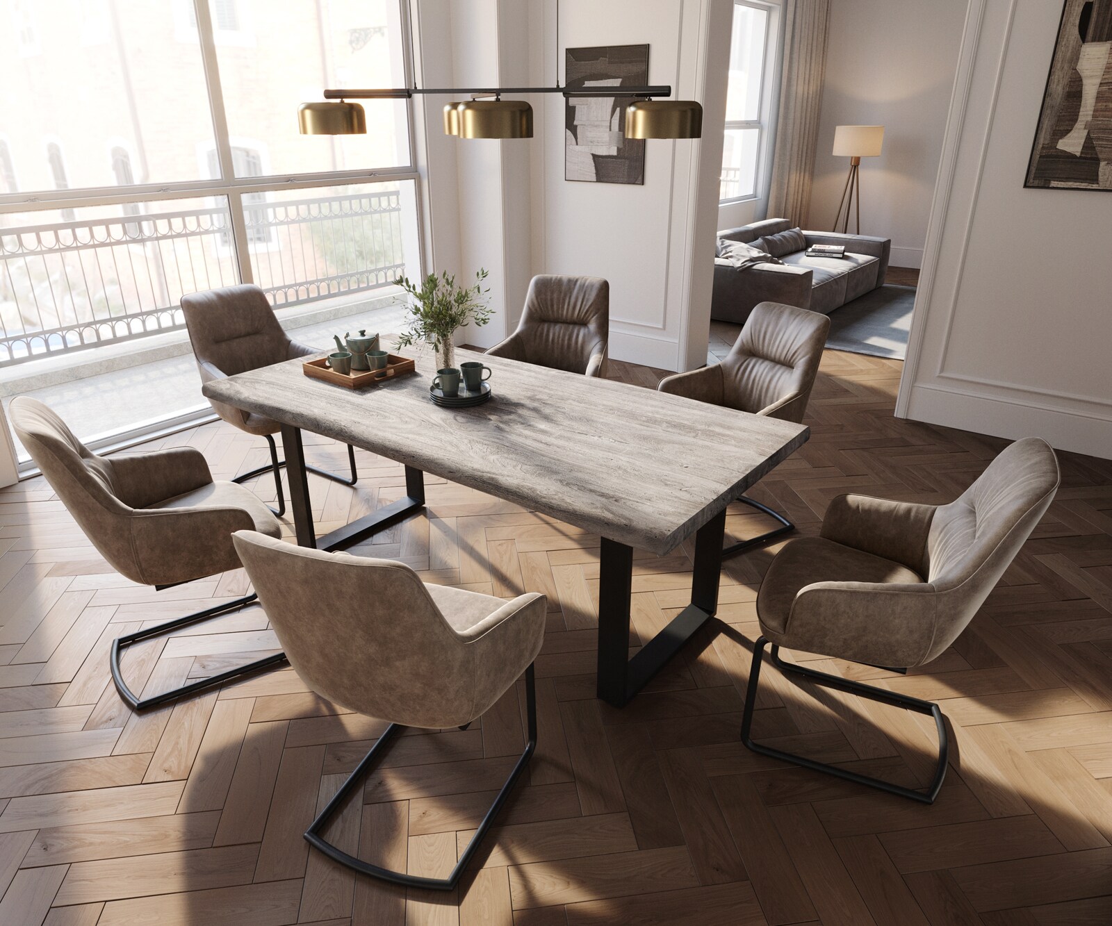 Chaise-de-salle-à-manger Zelia-Flex avec accoudoirs microvelours taupe vintage pied croisé large noir ressorts ensachés